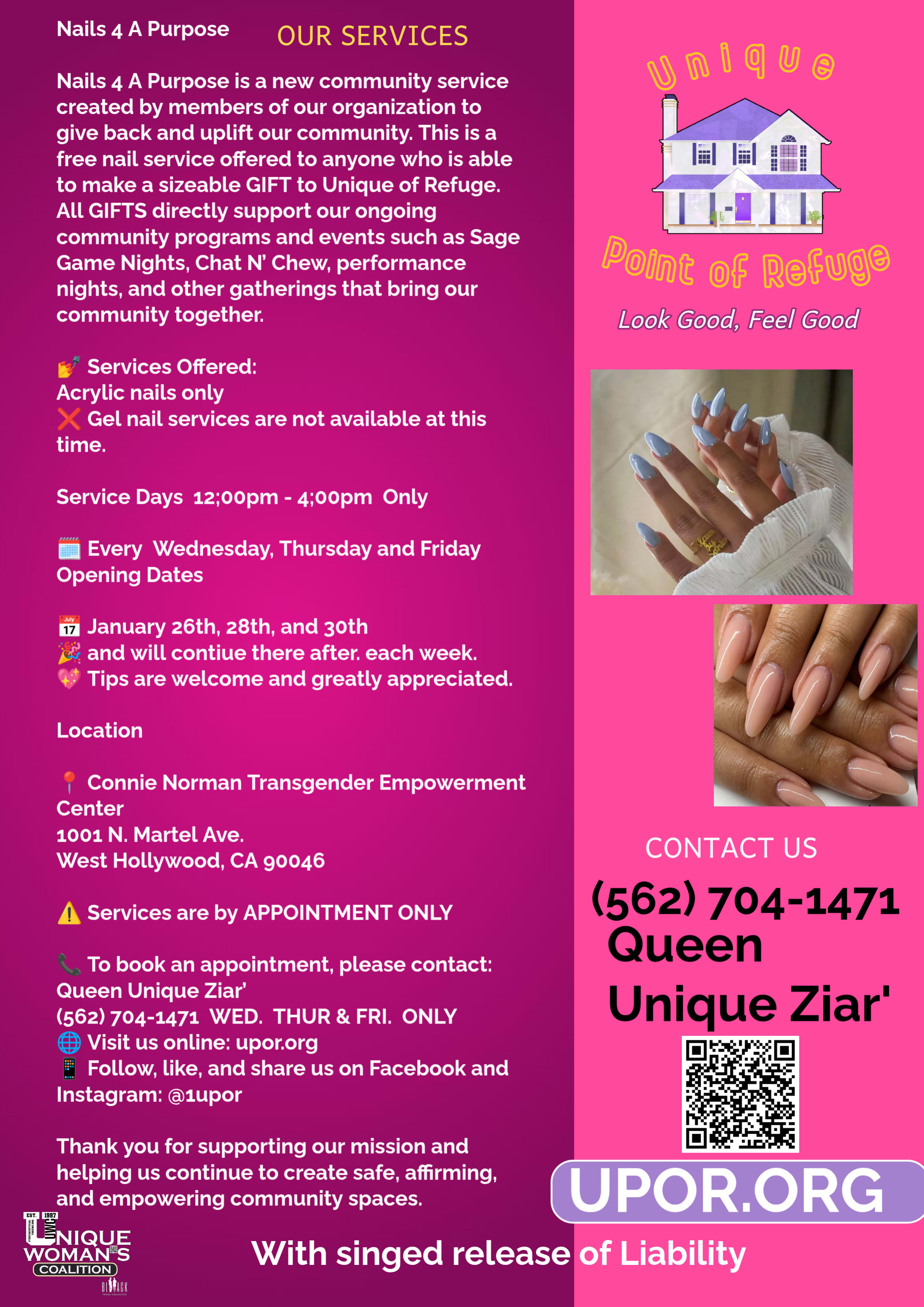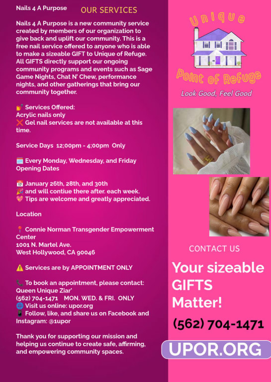 At Unique Point of Refuge, for us, by us. We understand that there are many transgender people of color who need social justice and many types of aid, we are ready to provide our services to those in the Los Angeles County being based in the West ...